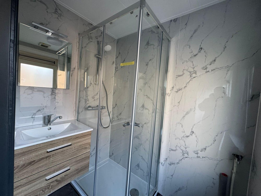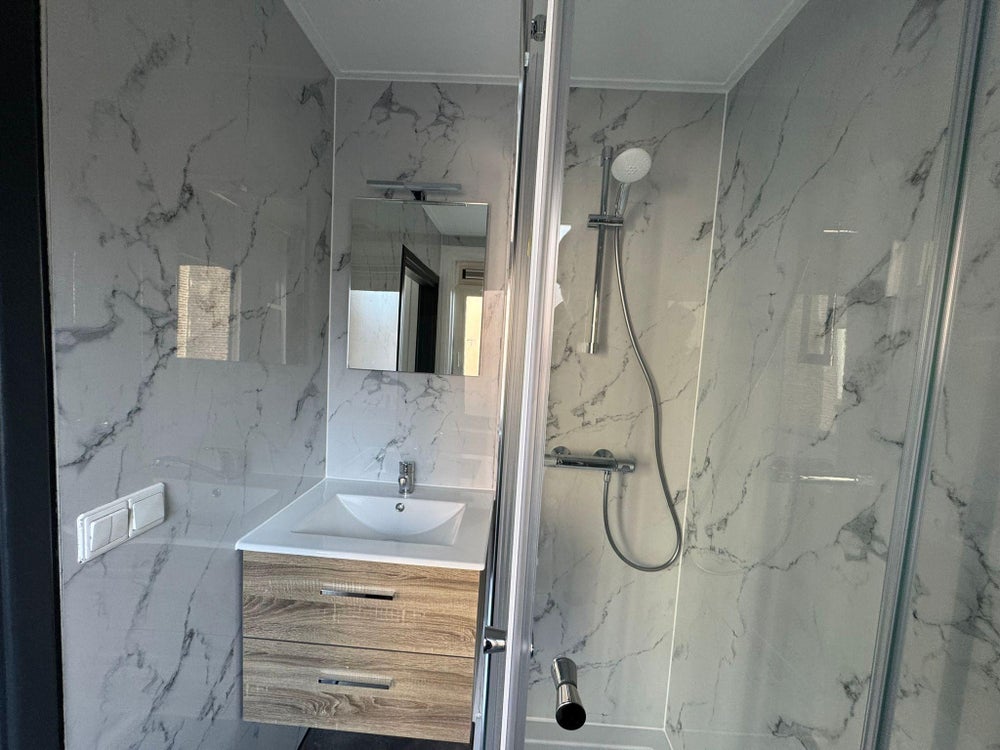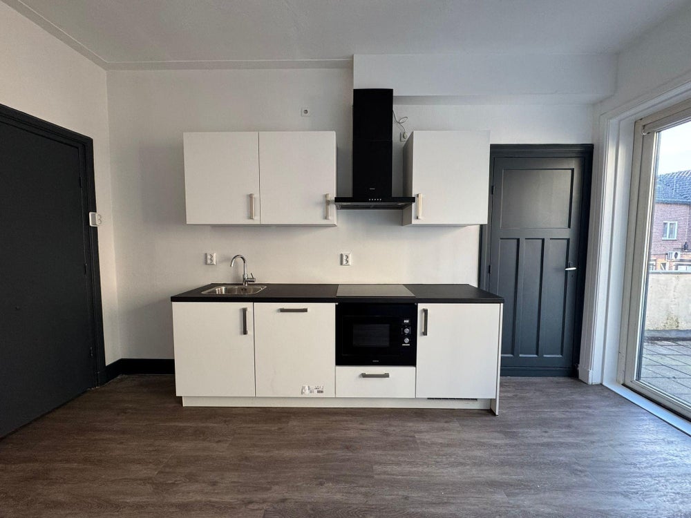 Hal, keuken met inductiekookplaat, luxe rvs wasemkap, vaatwasmachine koel- vriescombinatie en extra kastruimte. Via de keuken is toegang tot de luxe badkamer. Vanuit de keuken is ook toegang tot het ruimte 8m² dakterras.