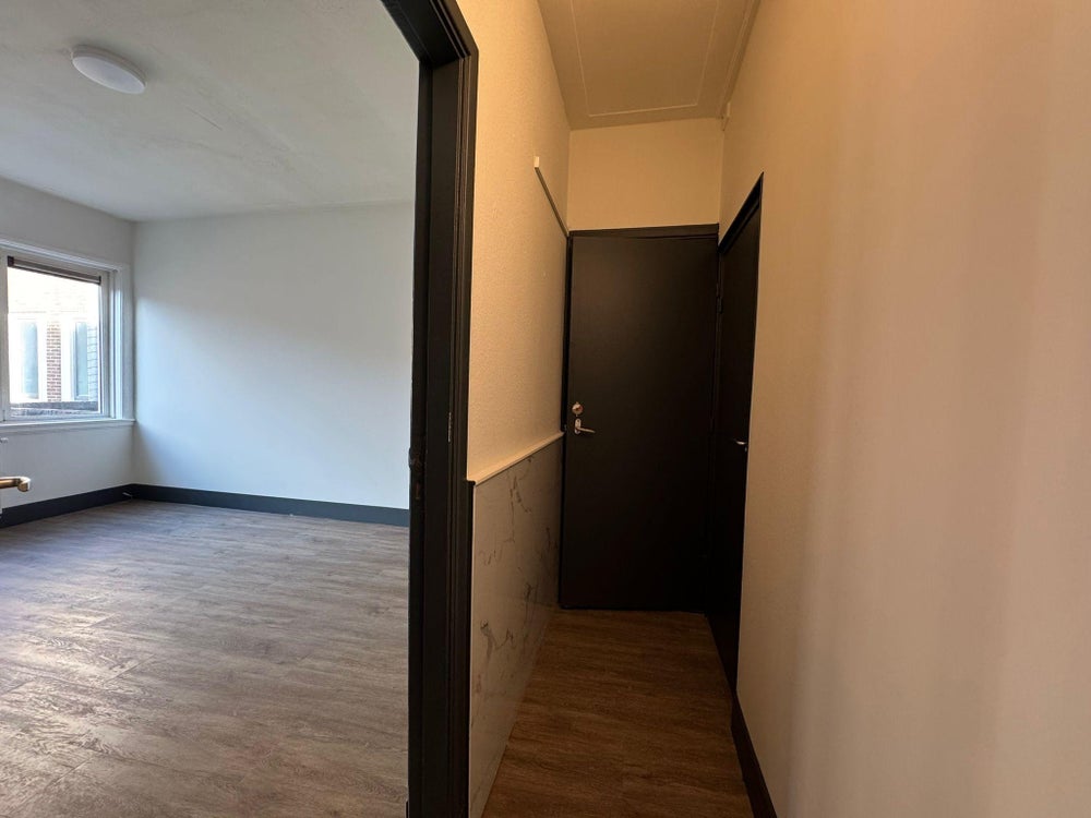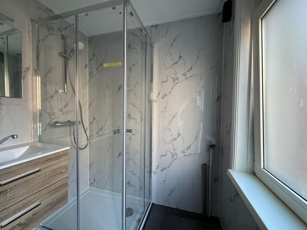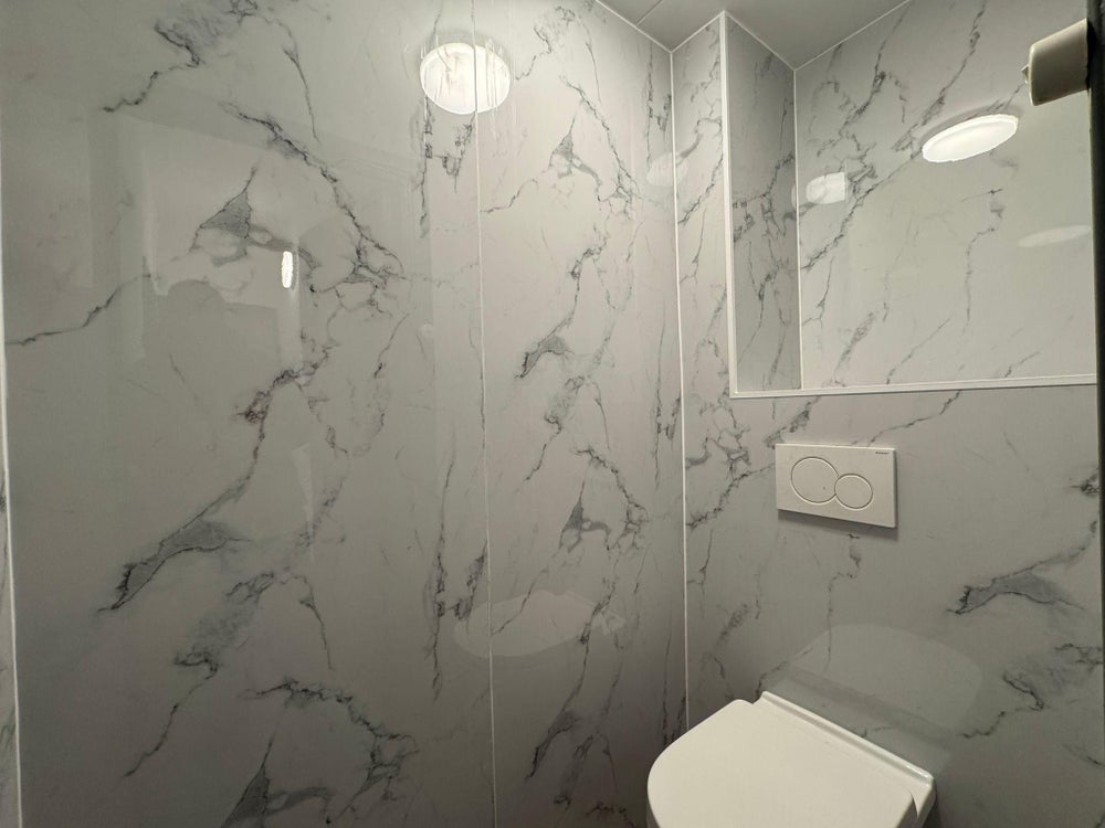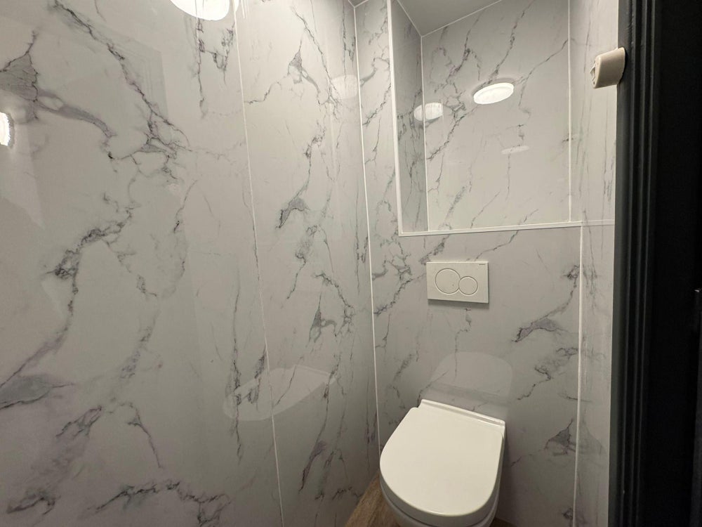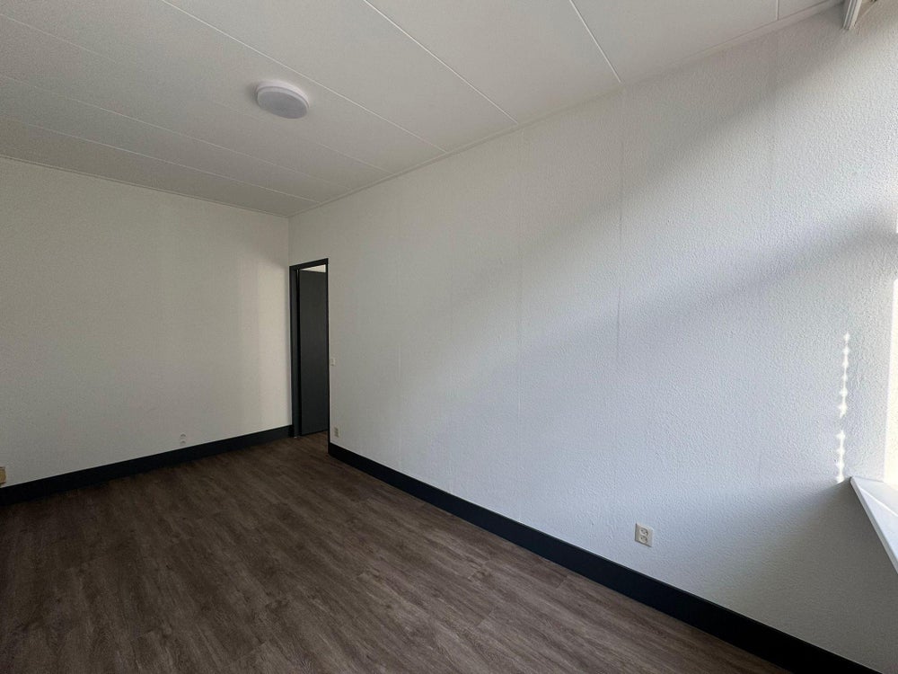Terug via de hal is het toilet en toegang tot de woonkamer. Vanuit de woonkamer is toegang tot de slaapkamer.