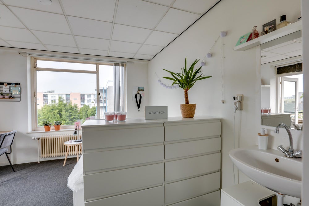 In het studentencomplex aan de Van Heuven Goedhartlaan in Utrecht bieden we deze leuke studenten kamer te huur aan. Deze specifieke kamer heeft een oppervlakte van 11 m2. Op elke verdieping bevinden zich vijf kamers, allemaal uitgerust met een gedeelde badkamer, keuken en apart toilet. Elke kamer beschikt over bergruimtes/inloopkast en een eigen wastafel met spiegel.